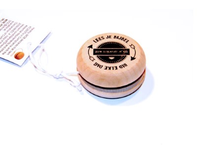 - Houten jojo aan beiden kanten bedrukt.